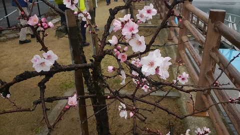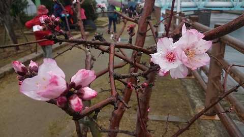 アーモンドの花1あられ(霰)にもめげず、魚崎浜の「東水環境センター」までやって来ました。予想はしましたが、もちろん満開ではありません。