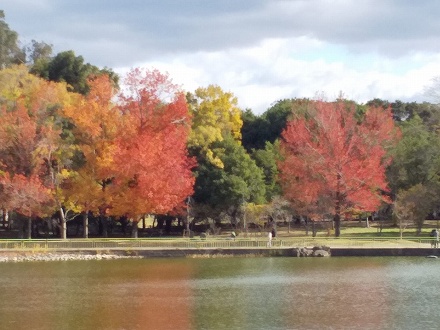 大池に架かる一文字橋から、東岸のモミジバフウを遠望。