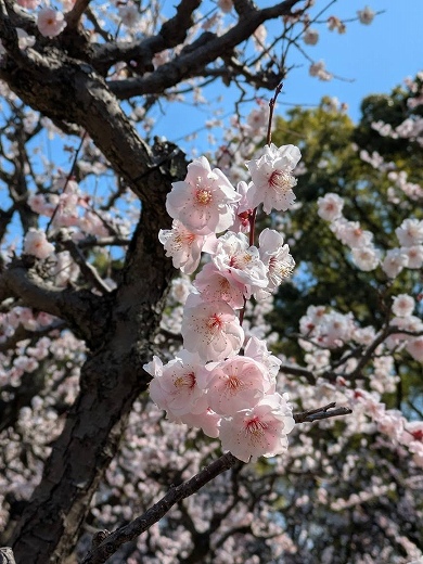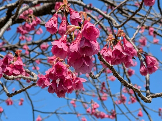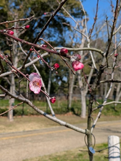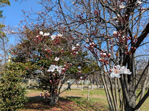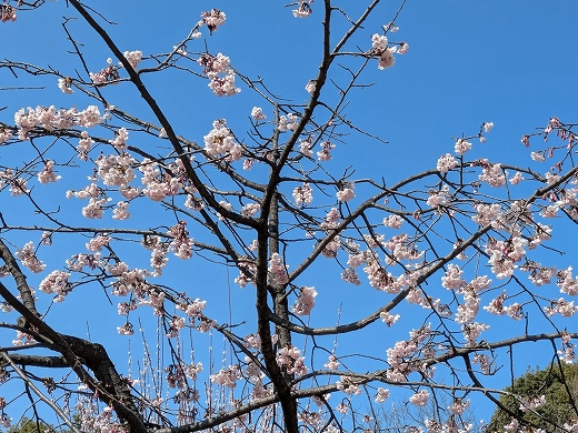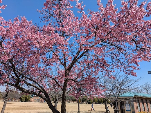 梅園の片隅に一本のオオカンザクラが開花しました。