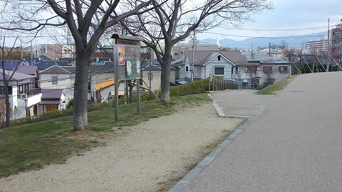狭山池堤防に上る道が現れました。右手には副池が見えました。