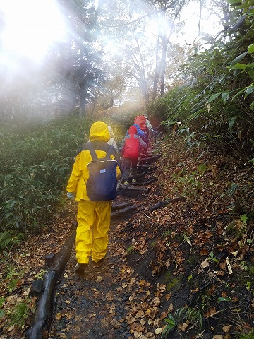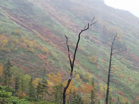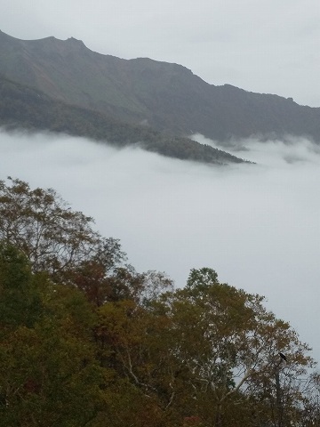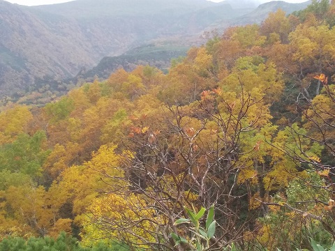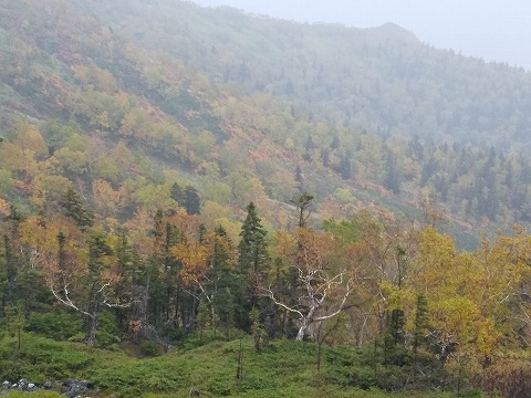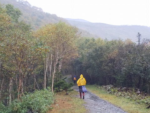 | 雨の黒岳&銀泉台を歩く 2022年9月23日 前日は銀河の滝、流星の滝をバスを降りて眺めたあと、層雲峡温泉に宿泊しました。黒岳ロープウェイはすぐ近くです。何度も泊まったことはあるはずですが、記憶に残っていないようです。 3日目は初めて訪れる黒岳&上川町の銀泉台でした。予想を早めて朝から小雨が降り、午後は本格的な雨となりました。しっかり歩いたつもりですが、登り下りのある道でもあり、かろうじて 5kmにとどまりました。不満はありません。 丈夫なカッパを持参したつもりなのに、Tシャツ、ダウンベスト共に濡れてしまいました。体が冷えてしまい、困ったことになりました。気づいたのは、最後に銀泉台から降りてきたころだったのが幸いかな? 紅葉に関しては、前日よりも良かったと思いました。旭岳は高山植物の紅葉、黒岳&銀泉台はダケカンバの紅葉となった次第なり。 なお、青森はブナ林の黄葉でした。北海道&青森は「黄葉」という方が正しいのですが。。 ![]() 層雲峡駅(670m)から五合目の黒岳駅(1,300m)までロープウェイを利用しました。 ![]() 次のリフト乗り場まで歩いたときに見つけたエゾオヤマノリンドウです。 ![]() リフトで七合目(1,520m)まで登るときに黒岳の山肌の紅葉をチェックしました。 ![]() ![]() 新しく整備された道なので歩きやすいと、ガイドさんが言います。異議なし。 ![]() ![]() ![]() 標高1,000mを超えると、ダケカンバの林が広がるようです。 ![]() ![]() ![]() ![]() ![]() 黒岳の麓から赤岳の麓まで、バスで移動しました。本格的な雨の中を「行けるところまで歩こう」とおだてられて(騙されて)、石ころと水たまりの道を歩き始めました。 ![]() 赤岳登山口から、山を登り始めました。石のゴツゴツした道を川のように水が流れ落ちます。 ![]() ![]() どこから水が入ってきたのか、謎です。10年近く使って来て (大雨のときにも役に立ってきたのですが ) 寿命が来たかもしれません。 あとで、カッパが劣化していることが分かりました。新しいのを買うことに決めました。 ![]() ![]() |