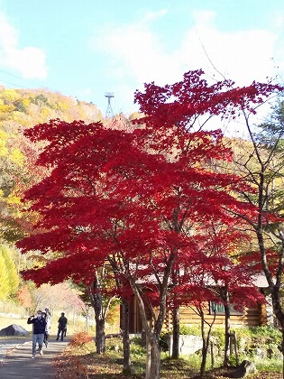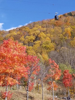 しらかば平駅1308mからロープウェイに乗りました。一番低いところの紅葉が広がっているのがよく見えました。