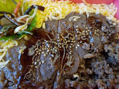 新大阪駅で購入した駅弁 (鹿児島の駅弁) を高山本線の電車で食べました。ビフテキ重に見えるでしょうか?