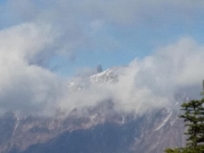 西穂高口駅 (2.156m) の展望台から、岐阜県の単独峰で最も高い笠ケ岳を眺めています。
