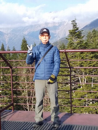 槍ヶ岳をバックに写真を撮っていただきました。おかげで、写真を買うハメになったしだいです。お葬式用に使えるでしょうか?