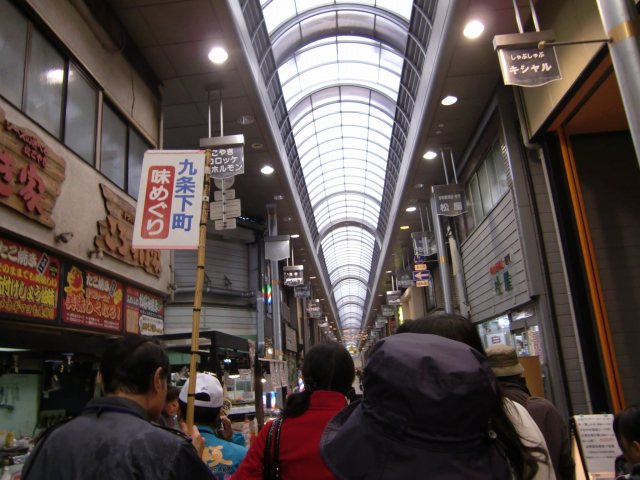 | 雨の降る日には、商店街は有り難いものです。ここには、キララ九条商店街という名がついています。 南側にもうひとつ、でかいのが続いています。それがドーム球場に繋がっているわけです。 |