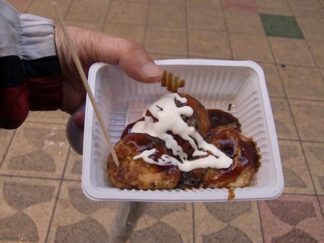| 温かいのが3つも入っています。これが食べ歩きの始まりでした。たこ焼きはとろっとして、かなり美味しかったです。 |