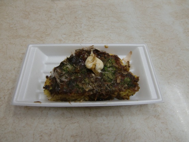 | まさかと思うけれど、たこ焼きのあと、お好み焼きが登場しました。さすがに、これはお店に入って戴きました。 |
