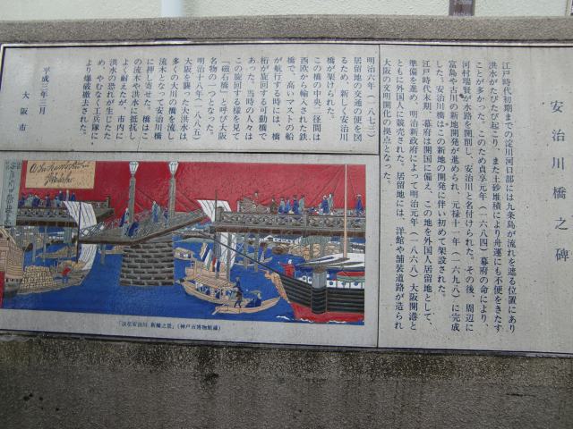 | 安治川橋は明治6(1873)年頃に架けられ、マストの高い船の航行の邪魔にならないように、ろくろを使って旋回させる珍しい可動橋でした。 しかし、明治18(1885)年の大洪水で橋に多くの木々が絡まって危険だということで、爆破されたとのことです。 |