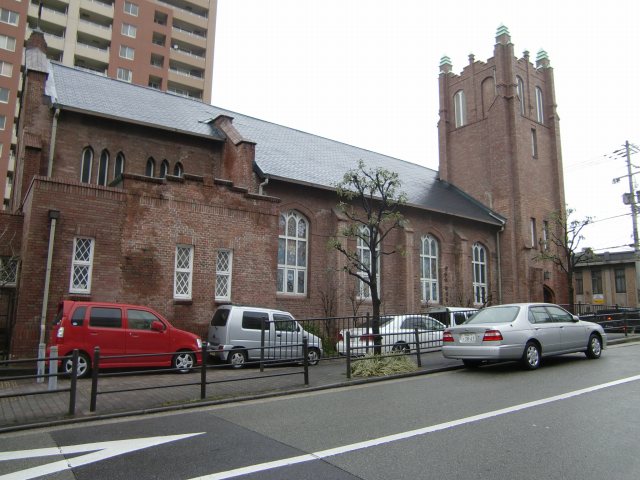 | 川口基督教会。川口居留地の面影を残す唯一の建物です。大正9(1920)年に再建されたもので、大阪府指定有形文化財となっています。当日はお葬式があり、中に入ることができなかったのが残念です。 イギリスの国教[聖公会]の教会で、プール学院や桃山学院も同じことがわかりました。 |