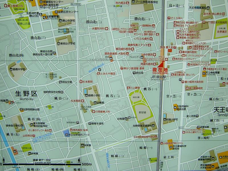 | 駅に設置してある地図はたいてい上が南になっている。 要は慣れだと思うが、上が北になっている本来の地図に変えてほしいという気持ちは揺るがない。 青色表示の「桃谷駅前商店街」を通り、「みゆき通中央商店街(生野コリアタウン)を目指す。 最後は「鶴橋本通商店街」からJR鶴橋駅に向かう。 |