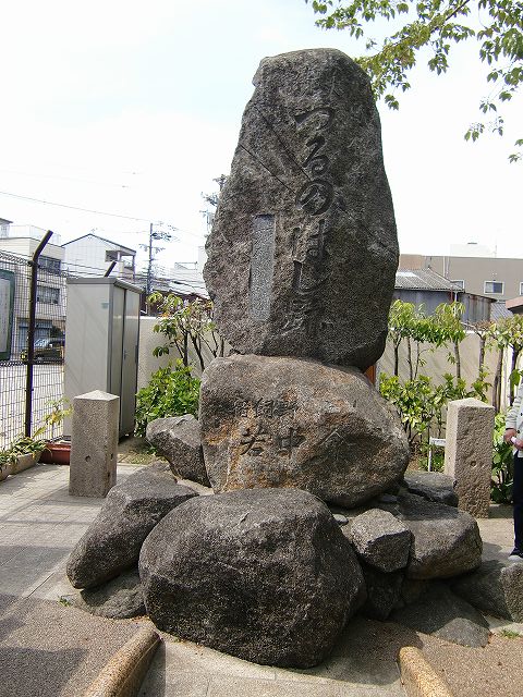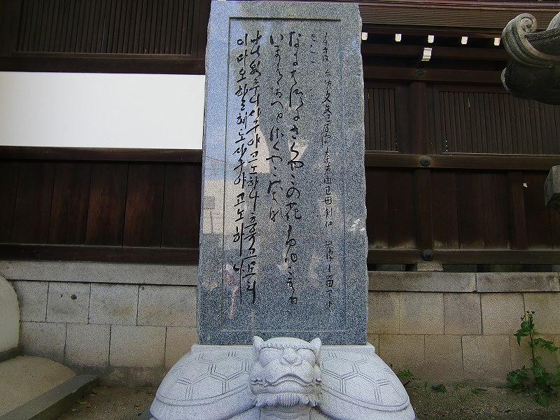 | 『難波津に咲くやこの花冬籠り 今は春べと咲くやこの花』と歌われている詩は、 1600年程前の渡来人・王仁(わに)博士が仁徳天皇の即位を春の到来になぞらえて祝い、贈った詩とされています。 コリアンタウンならではのハングル歌碑です。 |