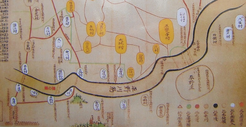 | 元禄14(西暦1701)年の平野川・大和川絵図の一部です。 地図の左には、平野川筋に「鶴の橋」、その上(東側)に「猪飼野村」とあります。 現在は「猪飼野」という由緒ある地名はすべて、まちから消えてしまいました。 |