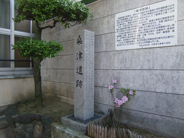 桑津小学校正門横に桑津遺跡の標識が立っている。 弥生時代の遺跡で、周辺地域では縄文時代の石ぞくも見つかっており 桑津地域に人が住み始めたのは約1万年前にさかのぼることが判明した。