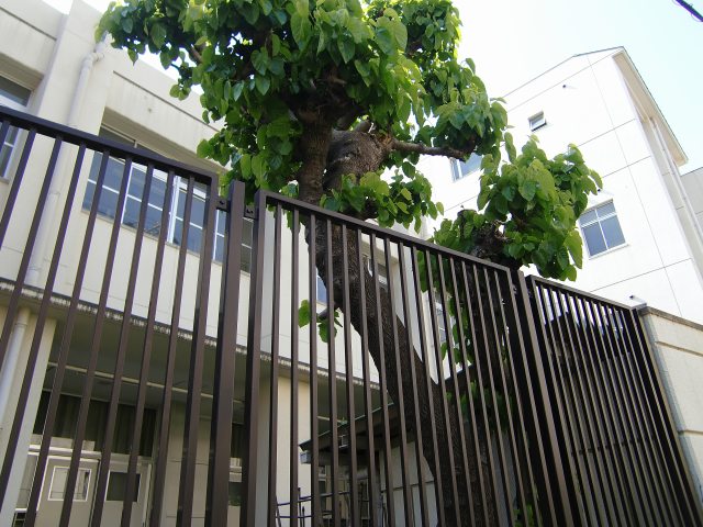 桑津小学校の樹齢100年に達する桑の木。 この小学校では、今でも蚕を育て、その繭から糸を紡ぐ体験的な学習が行われているとのことである。 地元の参加者が語ったことだから間違いあるまい。