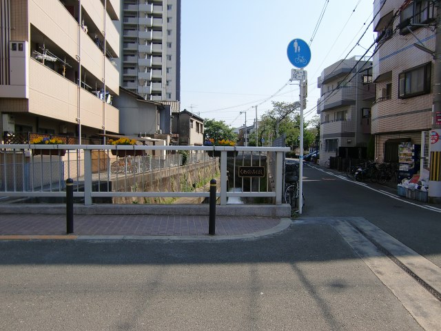 「くわのみばし」から見た駒川の流れ。 現在の水源から阪神高速道路あたりまでは何度も歩いたし、 今回の「大阪あそ歩」で阪神高速道路以北を補ったので、駒川の見納めをしてもいいと思った。 なお、元の水源は依羅池と聞いたので、疑問のひとつが解明した。