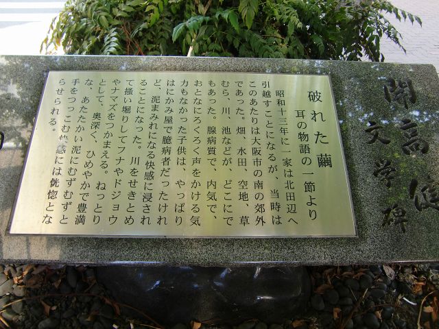 近鉄南大阪線「北田辺」駅構内につくられた開高健の文学碑。大阪市大法学部を卒業して 壽屋(現サントリー)に入社するが、27歳のときに「パニック」を発表して作家として注目され、翌年「裸の王様」で芥川賞を受賞する。 やがて作家活動に入り、東京に転居した。