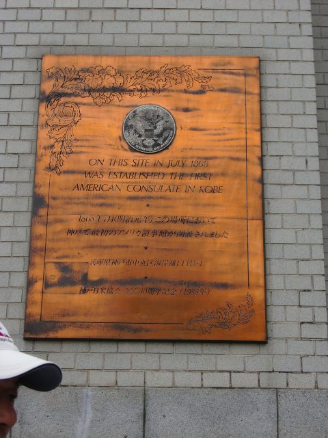 元外国人居留地にやってきた。その西南部にアメリカ領事館の銘板がある。 神戸村の庄屋、生島四郎太夫の邸宅がそのまま利用されたようだ。