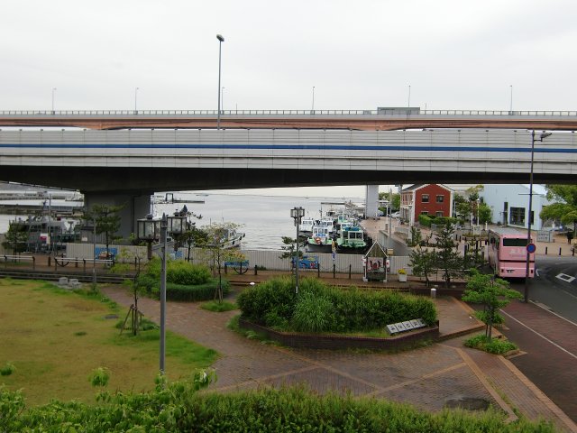 歩道橋も登ると海の近さがよくわかる。ここからは、神戸ポートタワーもよく見えた。 この下の広場には、兵庫県知事を勤めた陸奥宗光の石碑が建っているが、見学は省略された。