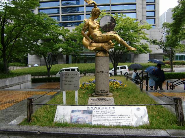阪神大震災の記憶。震災のため、このマリーナ像は倒れ、そのとき時計は壊れた。 震災の記憶を永遠にとどめるため、この時計はその時を示している。(平成7年1月17日)午前5時46分のことである。