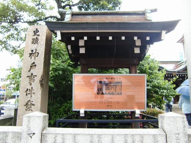 三宮神社。「史蹟 神戸事件発生の地」である。1868年に備前藩士の隊列を横切ろうとした米英仏兵との諍いから 大掛かりな交戦状態となった。最後には、第3砲兵隊長の切腹で責任をとらされることになった。