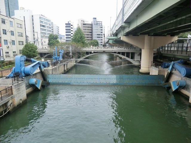 下流側(平野橋方面)の水門の手前で、水位が同じになるのを待っています。