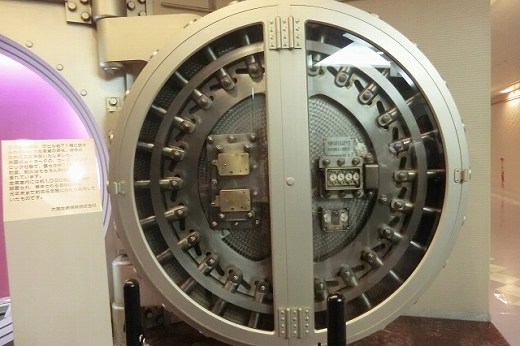 旧ビルで使われていた大金庫室の扉を展示してある。