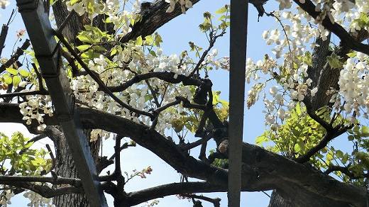 藤棚に白い花、藤色(紫系)ではありませんが、これも藤のようです。