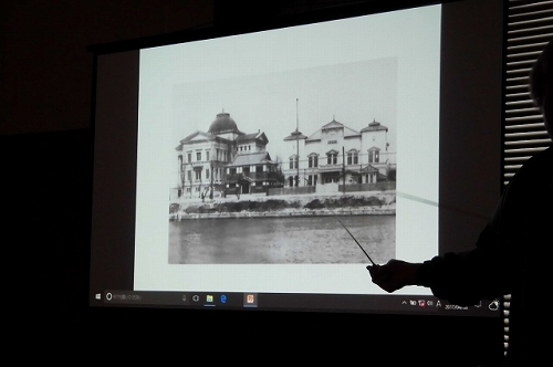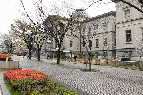 | 大阪あそ歩×中之島図書館 2017年4月8日 本日の「あそ歩」のタイトルは「蜆川・堂島川・土佐堀川」でした。 中之島図書館とのコラボということで、先ず図書館のスタッフによる案内と解説がありました。 そのあと、図書館の一室をお借りして、茶谷さんの講義が約1時間。 そのあと町歩きになりましたから、これは時間がかかるな‥と思い、途中でリタイアしました。 それでも3時間半でしたから、J1のことも気になるし、わたしの到らないところでございます。 ![]() 市役所回りのツツジもいいですね。目指したのは中之島図書館です。近ごろウォーキングのスタート&ゴール地点にもなる場所(市役所南・中之島公園)に近く、冬場はマッピングのスクリーンにもなったりしたところです。 ![]() 正面玄関です。外から眺めることは多いのですが、実は一度も中に入ったことがありませんでした。 ![]() ここもウォーキングでしばしば歩く中之島遊歩道の一部です。堂島川沿いのさくらがいいですね。 ![]() 「大阪あそ歩委員会」の代表理事、茶谷幸治さん直々の講義です。その中に出てきた写真をゲット。左が大阪図書館(現在の大阪府立中之島図書館)、右が初代の中央公会堂です。真ん中に怪しげな木造の建物有り。 ![]() 図書館の中央部にあった展示なり。住友吉左衛門の寄付によって建てられました。設計者は中央部が野口孫市氏、左右の両翼が日高胖(ゆたか)氏によるものです。市民の寄付によって建てられたのは、あとには中央公会堂や綿業会館がありますが、その先駆けとなったわけです。 棟札には、工事顧問として辰野金吾氏の名がありました。 ![]() 「淀屋の碑」: 残念ながら、この碑が建てられたのは昭和62年と、随分新しいことなり。淀屋を創業した岡本家によるものを前期淀屋、闕所後に牧田家により再興されたものを後期淀屋と呼んでいます。 闕所前に倉吉に暖簾分けした牧田家の淀家が、幕末に大阪の淀家を再興し、薩長側に資金援助して倒幕に全力を注いだ話は痛快以上の怨念を感じました。 近ごろ倉吉に行く機会がありましたが、淀家の存在を地図で確かめました。ツアー故、そこを訪れるチャンスがなかったことが残念なり。 ![]() 「北新地」(新地本通)のほぼ真ん中に建てられた碑です。小春、治兵衛が登場する「心中天網島」のことが書かれているそうです。もともと読みづらく、雨のせいもあって、お手上げです。 ![]() 「堂島新地」及び「北新地=曾根崎新地」の地図です。「蜆川」の川筋がよく分かるものです。「蜆川」のいわれですが、蜆が採れたからではなく、次第に川幅が縮んでいったことからきたという一説を語ったのは茶谷氏でございます。 |