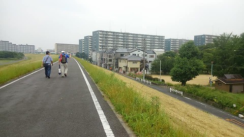 | 大阪あそ歩 2019年6月2日 大阪あそ歩(太子橋・今市) 淀川の風に吹かれて旧淀川の堤防跡をたどる 〜かつての地形に思いをはせる(その1)〜 最後に守口市と大阪市(旭区)の間のギザギザの境界線を訪ねたところがお気に入りなんですが、 写した写真は個人情報入りなので、アップロードするのは控えました。 ![]() かつて知りたる大宮神社 関目の七曲りからこの神社に至る「大宮道」(参道)があったことを知りました。 ![]() ![]() 京街道が通る今市に移りましたが、お安い自販機にお目にかかりました。50円は珍しくありませんが、40円は滅多にみることはありません。水を持参するのを忘れましたが、買いはしませんでした。 小雨がぱらつく天気で、体が求めていなかったからです。 ![]() 「京かいどう」です。かつて、梅田から野江に至り、そこからはまともな京街道を歩いています。 これとは別に、わたしが歩こうとしているのは「京快道」です。ここまではちょっと違いますが、同じ道を通ることもありそうです。 ![]() 西成郡豊里村大字天王寺荘字平田と東成郡古市村大字今市を結んでいたものです。豊里大橋ができる前のことでした。旧淀川の北にあったものが、今では新淀川の南になってしまいました。 ![]() 豊里大橋なり。東淀川区の方からこちら(旭区)に向かって歩いたことがあります。 ![]() 旧淀川の真ん中あたりが埋め立てられた後は、江野川(農業用水、排水・悪水の排出路)となりました。現在は阪神高速・守口線が通る道になってしまいました。 ![]() (豊里大橋を通る)内環状線を東に越えました。前に見える緑色の建物群が大阪市(太子橋3丁目)です。守口市側に突き出ているところですが、元はといえば、東淀川区の豊里、橋寺にあたるようです。 ![]() 太子橋保育園と淀川パークハウス(7棟・980戸のマンモス団地)。各棟に花の名前がついています。Aは、Akasia(アカシア)のようです。 ![]() 今では淀川の河床となっています。 ![]() 江野川筋遊歩道(緑陰道路)=阪神高速守口線の高架下 起点が旭区役所、終点が太子橋3丁目。その距離が3.3qなり。 ![]() |
