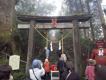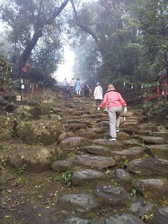 | 東霧島神社から錦江湾(1) 2023年3月10日 二日目は都城市の東霧島神社から始まり、鹿児島県の錦江(鹿児島)湾の東側を散策したあと、 霧島神宮温泉にまで戻りました。(5km) ![]() 東(つま)霧島神社の階段を登ります。 ![]() れで、階段の中ほどです。なかなかヘビーな登り坂で、何度か休憩しながら登りました。鬼岩階段といい、「振りむかずの坂」とも呼ばれるそうです。 ![]() 神殿(祭神はイザナミノミコト)まで登ったあとは、階段ではなく、別の下り坂を降りました。 ![]() 近頃は「鬼滅の刃」絡みで知られるそうです。 |