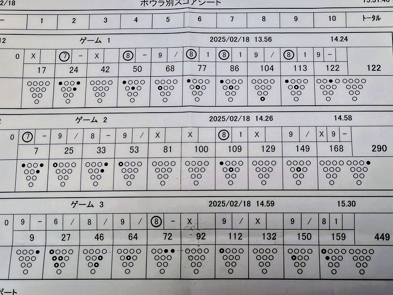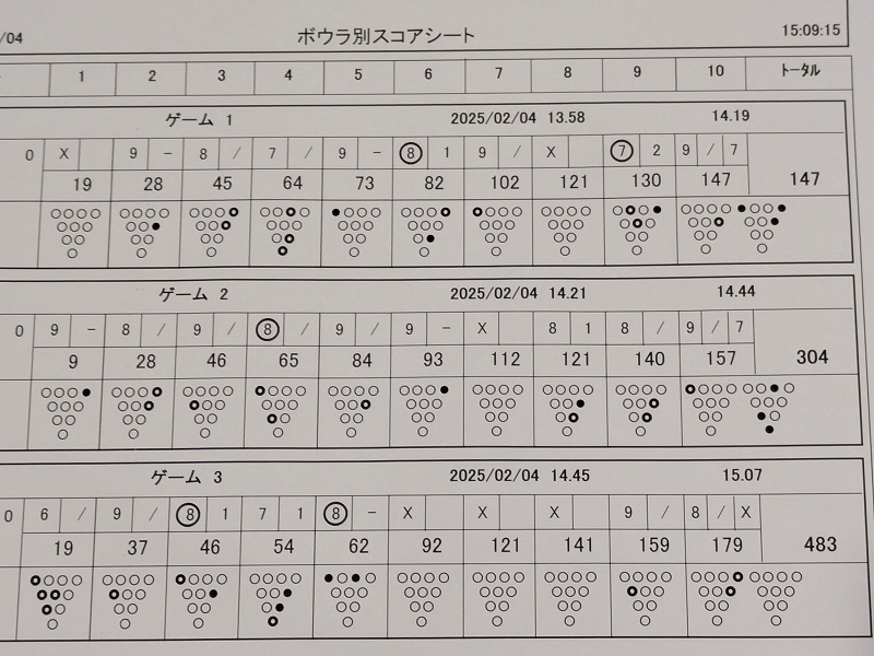| 2勝2敗 2025年2月18日 今日は恒例のボウリング大会がありました。相手は二人ですが、あと一人、仮のメンバーを追加して150点が与えられています。わたしのチームは三人です。2チームのハンディキャップは1点差なので、まずはコンスタントに得点をする必要があります。 第1ゲームは(3人計で)勝ち 第2ゲームは(3人計で)負け 第3ゲームは(3人計で)勝ち その合計は、(3人計で)負け 結局2勝2敗となりました。 わたしのスコアは 122, 168, 159, 計449(アベ149) ストライクが8, スペアが10・・ あと1点欲しいところでした。 ![]() |