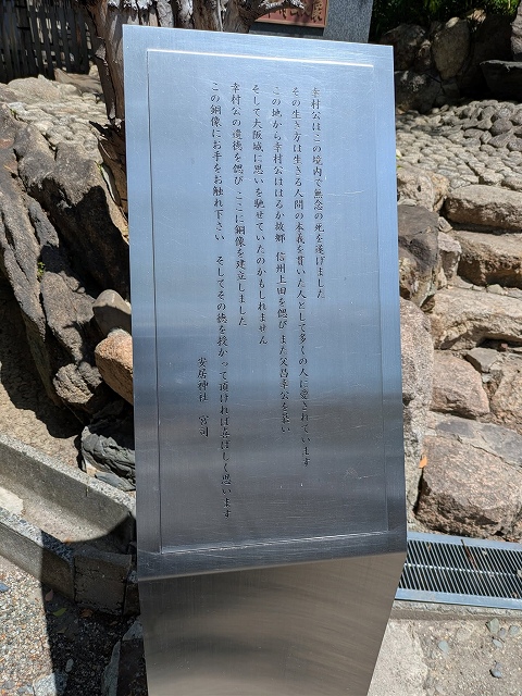 | 真田幸村の足跡をたどろう 2025年5月4日 のびのび例会 真田幸村の足跡をたどろう 中間ゴール8km+おまけ(5km) さほど暑くなく、快適なウォーク日和となりました。と言っても、体調不良につき、途中リタイアでございます。大阪城公園からスタートして天王寺で終わるか、新今宮まで行くかの違いなので、安易な方を選びました。 なお、幸村の娘12歳の阿梅、4歳の大八は、(道明寺の戦いの際、伊達政宗軍の先鋒を務め、幸村とも戦った) 片倉小十郎重長に引き取られ、その命を長らえるときができました。大八の子孫は、やがて仙台真田氏を名乗り、その血筋は今に繋がっています。真田信繁(幸村)之墓の開眼供養にも参加していたような気がしますが、どうだったのか自信がありません。 ![]() ![]() ![]() ![]() ![]() ![]() ![]() ![]() 大阪に初めて造られた幸村(信繁)の墓。 従五位下 真田左衛門佐豊臣信繁之墓 (じゅごいのげ さなださえもんのすけとよとみののぶしげのはか) 開眼供養の日、2014年10月吉日にわたしも参列しました。「大阪あそぼ」からのメールでこの日の除幕式(開眼供養)のことを知りました。 幸村の墓を造ることなど天領(幕府領)だった大阪ではあり得なかったのですが、時は過ぎ、幸村の死後400年忌に当たる年に認められたようです。記念碑となるものを残したいという研究者の思いが遂げられたとか。。 ![]() ![]() ![]() ![]() ![]() ![]() ![]() 真田幸村戦死跡之碑(安井神社内) 真田幸村のあちらこちらをお触りくださいと書いてありましたが、それは無しでしょう。。 間違えて、白黒写真となってしまいました。悪しからず。。 ![]() 茶臼山は 冬の陣 徳川家康の陣地となり、 夏の陣 真田幸村の陣地となる。 |