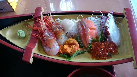 礼文島の北東端、金田ノ岬の傍で「海鮮舟盛り付き定食」を頂きました。大阪ではウニもイクラも食べませんが、こちらでは実に美味しく頂きました。