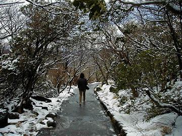 下りの道で雪の積もった下りの道を歩く。先を行くお方は誰でしょう? 敬意を表し、華奢なお方と言っておこう。馬酔木の木に積もる雪。まぁ、いいでしょう‥と自分で納得。 |