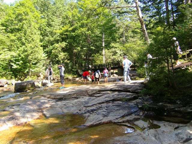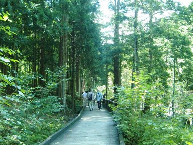 この地で、昭和57年に「第1回全日本森林浴大会」が開催され、「森林浴発祥の地」として知られるそうだ。 「赤沢美林ガイド」には森林浴の効用が次のようにまとめてあった。 1,殺菌効果:樹木が発散する酸素や香りには殺菌効果が含まれていて、病原菌や細菌を寄せ付けない作用が働いています。人にとっても好環境となり、その効果は想像以上のものです。 2,森林の香り:森林の中にいなくても、ひのきのようにすてきな香りに出会うとホッとするはず。樹木や草花の香りには心を静めるアロマテラピー効果があり、森の中を歩いていると、気持ちが安らいでくるのはこのためなのです。 3,森林の色:植物の種類や、季節によって森の色は異なってきますが、基本的には心理的に「落ち着き」を誘う緑が中心。感動的な紅葉の色も、心に新しい風を呼び起こします。 4,森林の空気:空気中のチリやススも、森林がフィルターとなってシャットアウト。適度な湿度とバランスよく調和して、わたしたちを優しく包み込んでくれているのです。 5,酸素の供給源:植物は二酸化炭素を吸って、酸素を発散しています。だから森林の中には、新鮮で中身の濃い酸素がいっぱい。思いっきり深呼吸をしてみましょう。 6,防風・遮光効果:よく成長した森林は、背丈も高く生い茂っているから、真夏の直射日光を遮り、いつも涼風のさわやかさ。強風や突風からもわたしたちを守ってくれます。 7,防音効果:都市の騒音は森の中にはありません。清流のせせらぎ、野鳥のさえずり、優しい風の音など、静寂の森に耳を澄ませば、心地よい自然の声が聞こえてきます。 快適な散歩道は、あっという間に終わってしまいました。  |