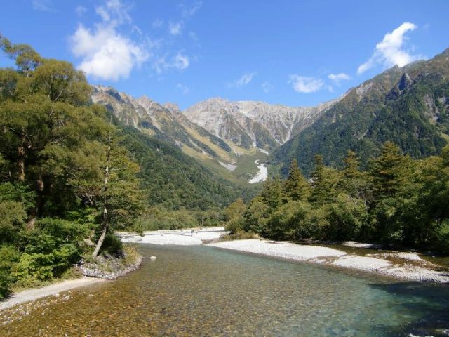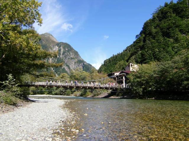 | 河童橋から上流を見ました。青空をバックに、穂高連峰がくっきりと見えました。明神岳2,931m・前穂高岳3,090m・奥穂高岳3,190m・間ノ岳2,907m・西穂高岳2,907mと連なっています。 |