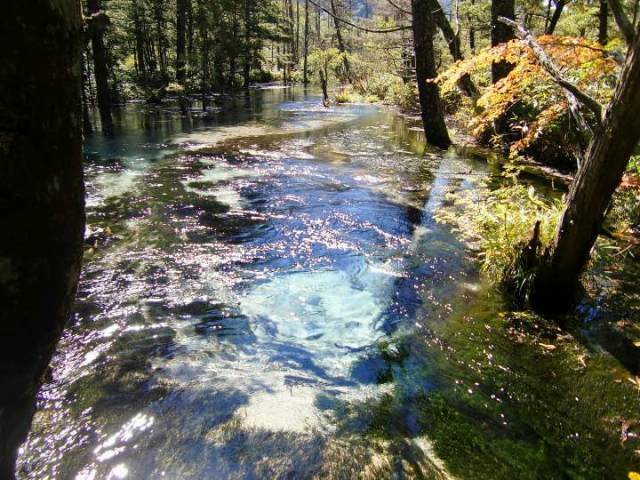 | 河童橋から沿山道路(右岸)を通って、明神池を目指しました。片道約60分の少々上り下りのあるコースでしたが、変化があって楽しかったですね。梓川に繋がる支流に陽光が注いでいるところを撮ってみました。 |