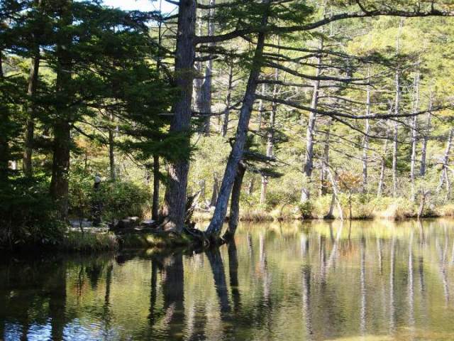 | 明神池1,540mに辿り着きました。とても浅くて透明な池でした。ここまで来て、入場料を払わないわけにはいかないのですが、なぜ取るのかが不明です。 |