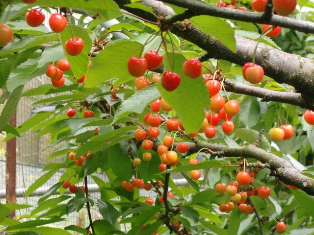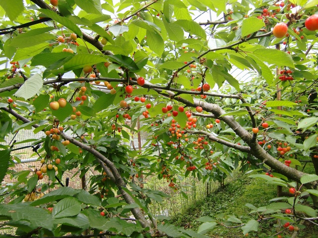 どこへ行くのか知らされないまま、サクランボ狩りツアーのバスに乗ってしまいました。 湖西道路を通って、福井県の越前海岸に近い「ドングリ山」のサクランボ園まで辿り着きました。 ここからここまで‥あはは柵で遮られて、真っ赤に色づいたサクランボには手が届きませんでした。