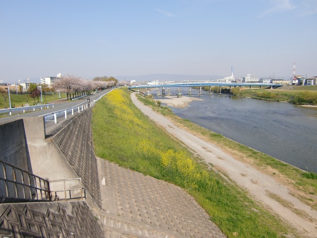 再び大和川堤防まで戻りました。河原に降りて上を見上げると、菜の花の向こうに桜並木が見えました。