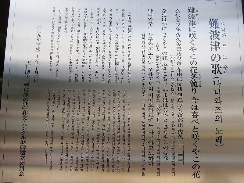 『難波津に咲くやこの花冬籠り 今は春べと咲くやこの花』と歌われている詩は、 1600年程前の渡来人・王仁(わに)博士が仁徳天皇の即位を春の到来になぞらえて祝い、贈った詩とされています。 コリアンタウンならではのハングル歌碑です。