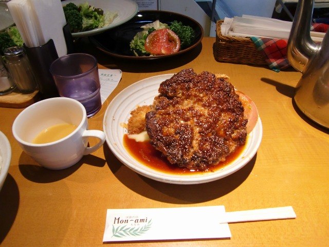 | ハンバーグとエビフライ、ごはんとスープつきで930円、 まことにリーズナブル(理にかなったという意味よりも、価格が安いという方が近い‥)なお店であった。 エビフライもサラダも、大きなハンバーグにお隠れになっているあたりが、このお店の「ウリ」に違いない。 |