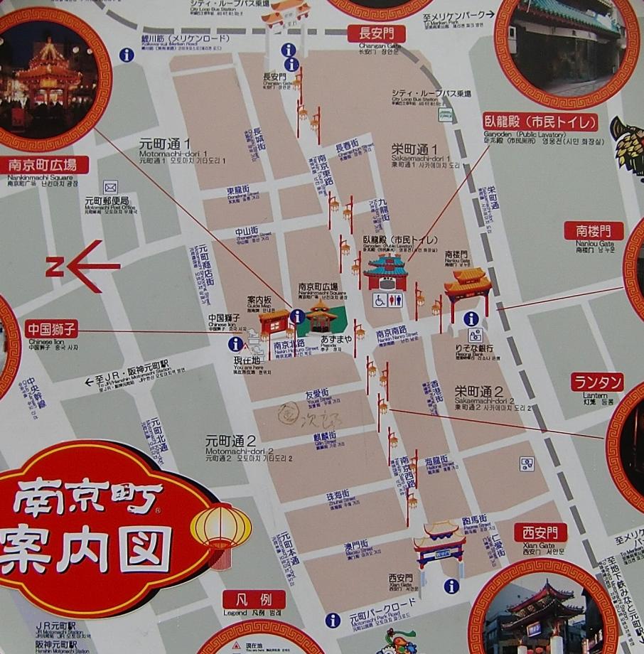 | 南京町には一度訪れたことがあるのだが、記憶もいい加減になってきている。南京町がこんなに近いとは思わなかった。 中国獅子像があり、すぐに案内板が置いてある。わたしは、地図が大好きなので、すぐにパチリ! |
