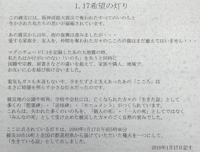 | 阪神大震災の記憶。震災のため、このマリーナ像は倒れ、そのとき時計は壊れた。 震災の記憶を永遠にとどめるため、この時計はその時を示している。(平成7年1月17日)午前5時46分のことである。 |