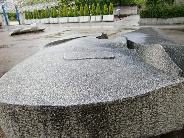 | スーツの紙型をモチーフにしたモニュメント。開国の翌年、イギリス人カベルが居留地で日本最初の洋服店を開業した。 |