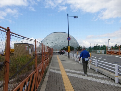 | なにわの海の時空館(大阪市海洋博物館)は第1チェックポイントである。 ドーム形の海に浮かぶ博物館へは地下道を通って入ることになる。 ちなみに、第2チェックポイントとなった大阪南港野鳥園からの帰りに撮った写真である。 |
