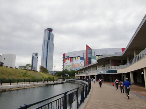 | 再び運河沿いのコースを通り、おおさかフードアウトレット(第3チェックポイント)を目指した。 最も高いビルがコスモタワー(元ワールドトレードセンター, 現大阪府庁舎)であり、 鮮やかな壁面を持つのがATC(アジアトレードセンター)である。 |