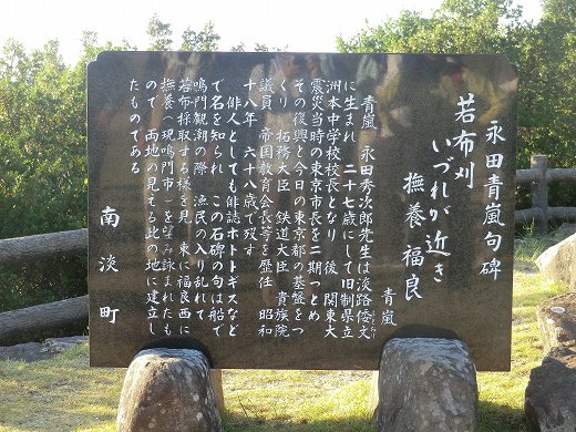 14.4km 2014年10月18日 最もアップダウンのあるコースでしたが、何とか乗り切りました。 車道を避けて、近畿自然歩道を歩いたり、某ホテル専用とも言うべき車の通らない道を歩いたりしました。 山の上から海を眺めたり、大鳴門橋を遠望するコースでもありました。 ![]() ![]() ウォークの始まりです。潮が引くと淡路島と繋がる砂州が登場します。伊豆にある堂ヶ島の三四郎島を思い出します。 ![]() 観潮船の出る福良港が道の駅になっています。ここまで約7km(行程の約半分)歩いてから、バスに乗って、なんとスタート地点の道の駅うずしおに引き返しました。お昼はいつもお弁当でしたが、今回は道の駅のレストランで戴くことになったそうです。美味しかったのですが、どうも引き返すのは勘弁して欲しいと思いました。福良港で昼食‥がフツーだと思います。 ![]() ホテル専用の風力発電がある丘の上から、ゴール地点を眺めたものです。海岸部の青い建物に近い神社がゴールでした。なお、風車を回すのにも電力がいるそうで、現在は風力発電を止めているそうです。 ![]() ホテルの前に広場があり、そこに句碑が建てられています。その方は、淡路島の生まれで、27歳で旧制洲本中学校の校長となったそうで、何の問題もなく、それをステップにしてますますのご活躍だったようです。近ごろの大阪市における民間校長の不手際のことを考えると、さっぱりワヤでございますね。選んだお方に問題ありとしか言えませんが。 若布はわかめで、撫養は鳴門市(徳島県)のことと説明しています。 ![]() 同じ広場から撮りました。大鳴門橋は(これで)見納めになりそうです。 |