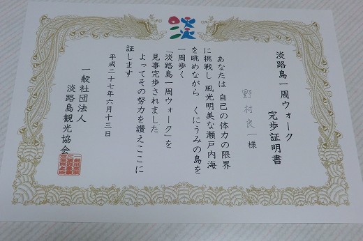 | 第15回<東浦〜道の駅あわじ>10km 2015年4月9日 本日が最終回でした。旅の最後に、感想なるものを書いたわけですが‥ 「旅費の9,990円は高すぎます。こういうのをぼったくりと言います。」 「最後だから、美味しい弁当が出ると思っていました。残念です。」 怖いものがなくなると平気でこんなことを書きます。そんなわたしが残念です。 ![]() 昼食の前に、「鯛おどる館」に立ち寄りました。行き過ぎて、引き返しました。 ![]() 買ったのは、玉ねぎ天・たこ天・いか天です。3つで1,000円に惑わされました。 ![]() ![]() ![]() 絵島の一番高いところに神社があります。平清盛の「大輪田泊(おおわだのとまり)」建設にまつわる秘話がありました。多くの方々の身代わりになり、人柱となった松王丸を祀ってあるそうです。 ![]() 道の駅あわじにて:ゴールテープが張られました。とても嬉しい仕掛けです。 ![]() 最後に記念撮影に応じた方々です。本来は40名以上が参加していました。わたしをお探しください。 ![]() 15コース全てを回った証拠のシールです。15(淡路島14+沼島1)コースです。 ![]() 最後にいただいたのは、やがて消えていく、ふつーの完歩証明書でした。 |